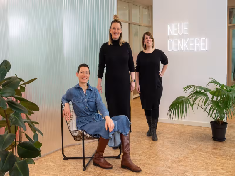 The founders and managing directors Madlen Freudenberg, Julia Heimeier, and Steffi Schürmann understand the Neue Denkerei as “Labor für kollaborative Prozesse, in dem die passenden Menschen in inspirierenden Räumen mit kreativen Methoden zusammenkommen und gemeinsam Zukunft gestalten.”